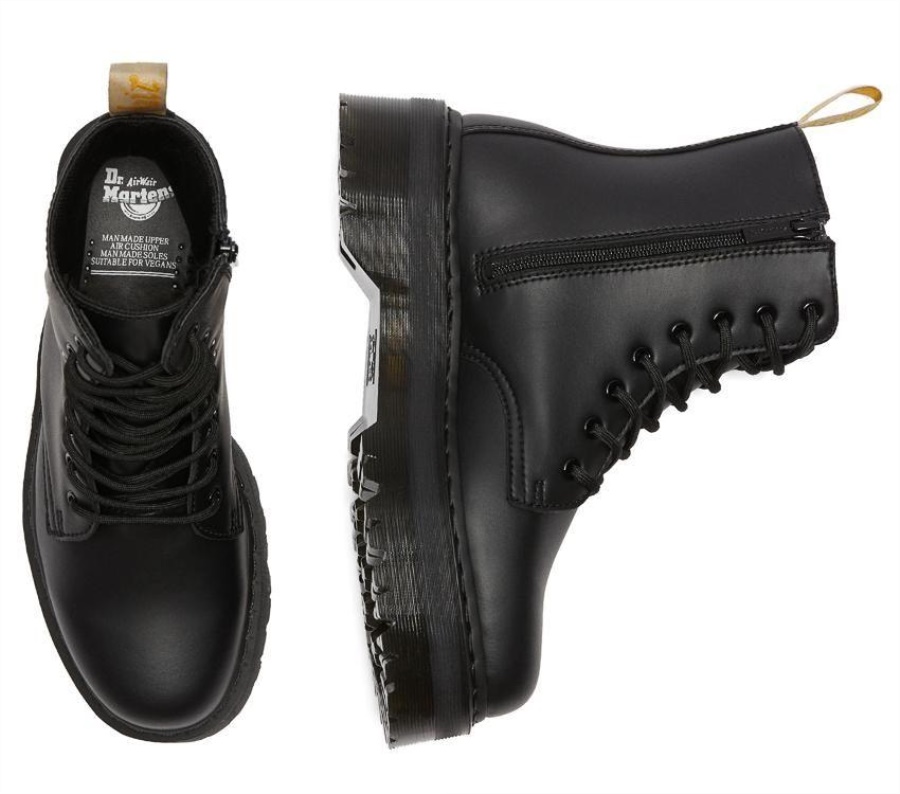 A full-volume revamp of Dr Martens' iconic original boot, the Jadon retains all the 1460's signature details-8-eyes, grooved edges and welt stitching-and adds a towering platform sole. In a monochrome vegan-friendly colourway, this edition loses the leather but none of the attitude. With a side zip for easy wear, the boot has a vegan scripted heel loop that contrasts sharply with the all-black silhouette.