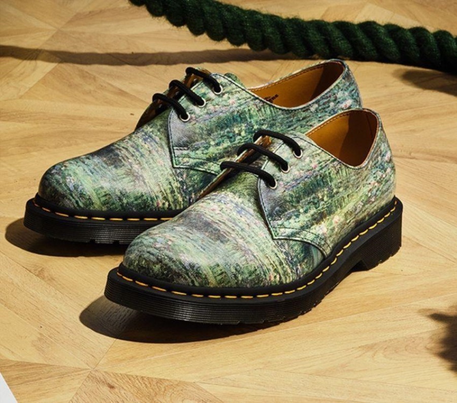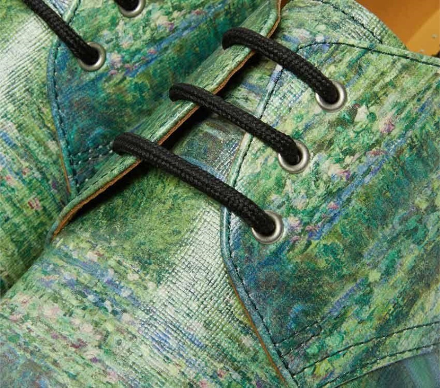 Oscar-Claude Monet is the founder of Impressionist art - impressionism comes from the title of his painting Impression. His ambition to document the French countryside led to paintings like The Water-Lily Pond where Monet repainted the same scene many times to capture the changing of light and passing of seasons. Here the classic piece is printed on our 1461 3-eye shoe and paired with brushed silver eyelets, black laces and yellow welt stitching.