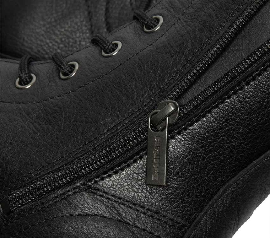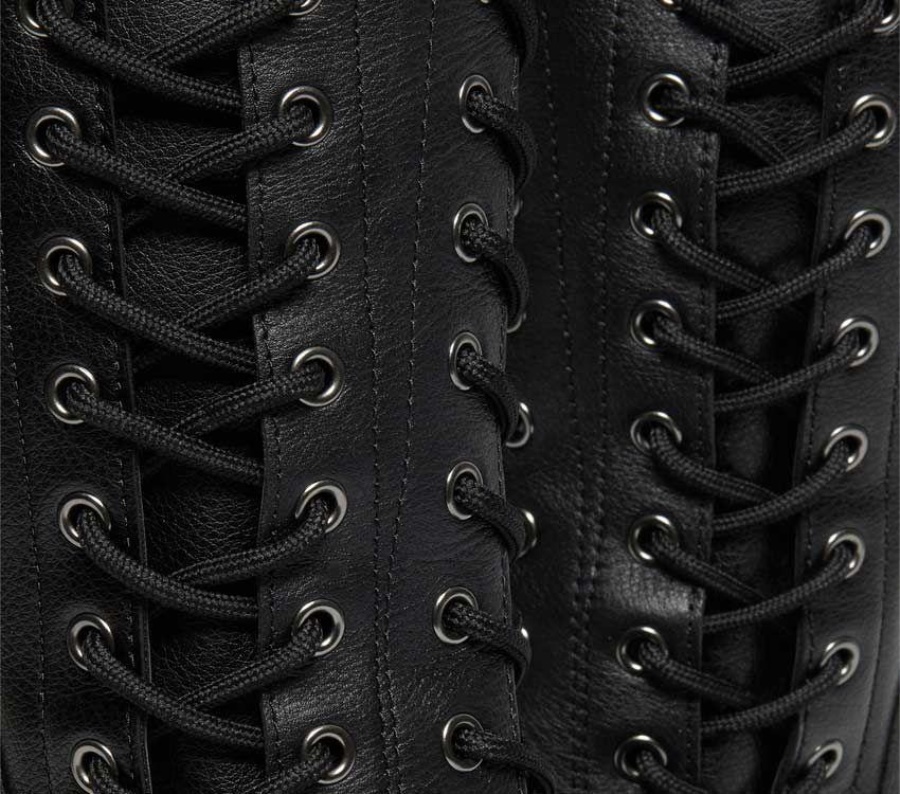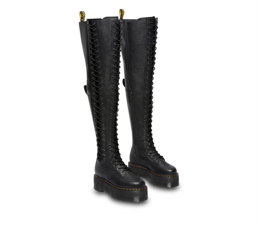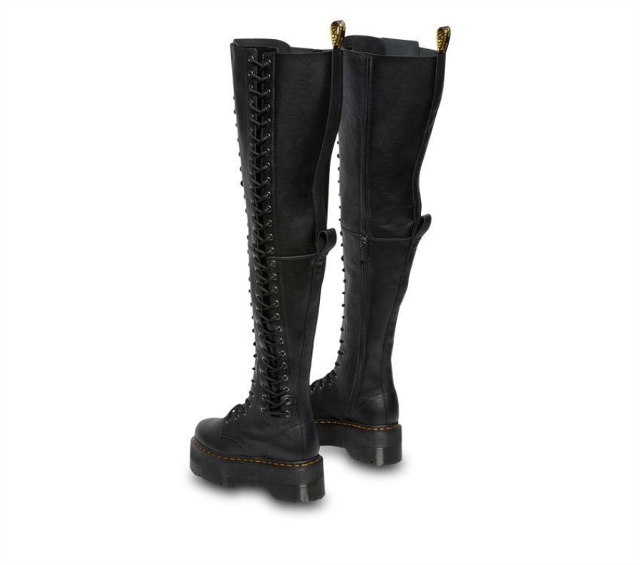 Footwear for the fearless. These towering 26-eye boots are welted on our highest ever platform: the stacked 2 1/4 inch Quad Retro Max. Built to make a scene. Crafted from a mix of soft Virginia leather and tumbled stretch PU for enhanced comfort, the thigh-high boots are loaded with gunmetal trims, a zip on the inside quarter and an adjustable lace for a secure fit. They're marked by our unmistakable yellow welt stitch and heel loop. These sky-high platforms aren't for the faint-hearted. Are you up to it?