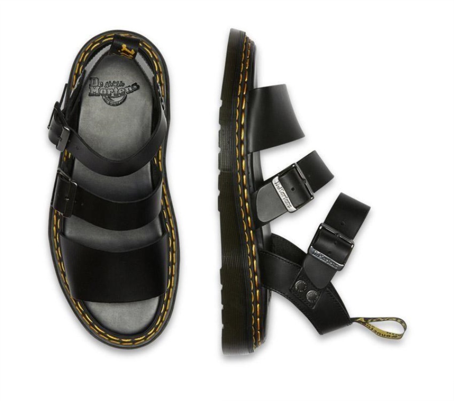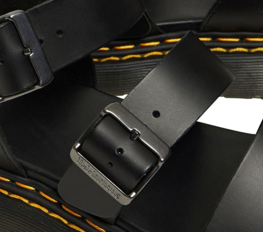 The double welt stitch is becoming a signature in our collection - an exaggerated twist on our unmistakable yellow thread that puts the spotlight on our welt and enhances DM's DNA. These double stitch Gryphon sandals are built from black Brando, a heavyweight, premium leather built to last, and fitted with gunmetal branded hardware and rivets. They're welted on a lightweight 1.57 Shore sole and finished with a scripted AirWair heel loop.