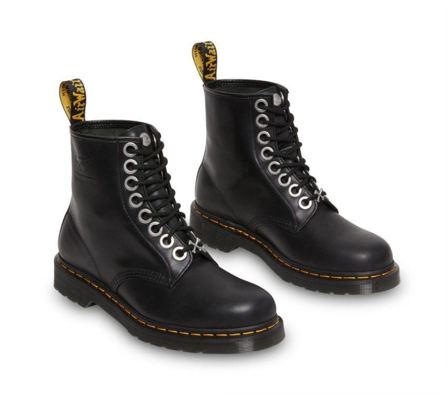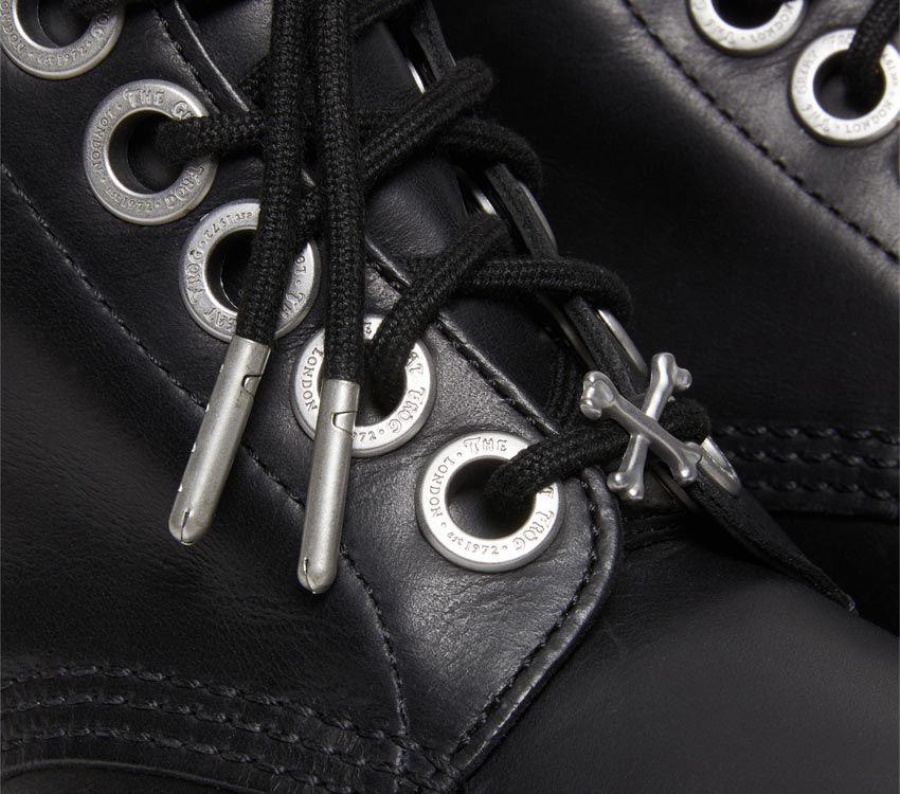 The Great Frog's handmade, gothic designs have been inspired and adopted by rock 'n' roll royalty ever since the London jeweller opened its doors on Carnaby Street in 1972. For 50 years, The Great Frog has adorned the hands, necks and wrists of subcultural rebels and outlaws. Now their dark metal aesthetic collides with our 1460 silhouette.?The 1460 TGF boot stays close to our roots-packed with instantly-recognisable DM's DNA, with elevated custom silver detailing. The?boot is built from supple black Oily Illusion leather with a The Great?Frog branded deboss on the outside quarter. We've elevated the?eyelets with branded brushed silver, the tongue is punched with a?brushed silver rivet, and the laces are fitted with a crossbones charm.?The boots remain true to six decades of durable DM's construction:?built on a smoke DMS outsole, secured with yellow welt stitching and?tagged with a black and yellow heel loop.